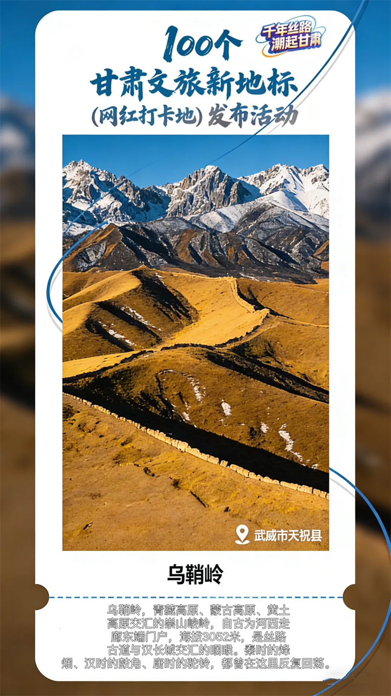 乌鞘岭位于甘肃省武威市天祝藏族自治县中部,属祁连山脉北支冷龙岭的东南端。为陇中高原和河西走廊的天然分界。也是半干旱区向干旱区过渡的分界线,也是东亚季风到达的最西端。东西长约17公里,南北宽约10公里,主峰海拔3562米,年均气温-2.2℃,志书对乌鞘岭有"盛夏飞雪,寒气砭骨"的记述,是古丝绸之路上河西走廊通往长安的重要关隘。