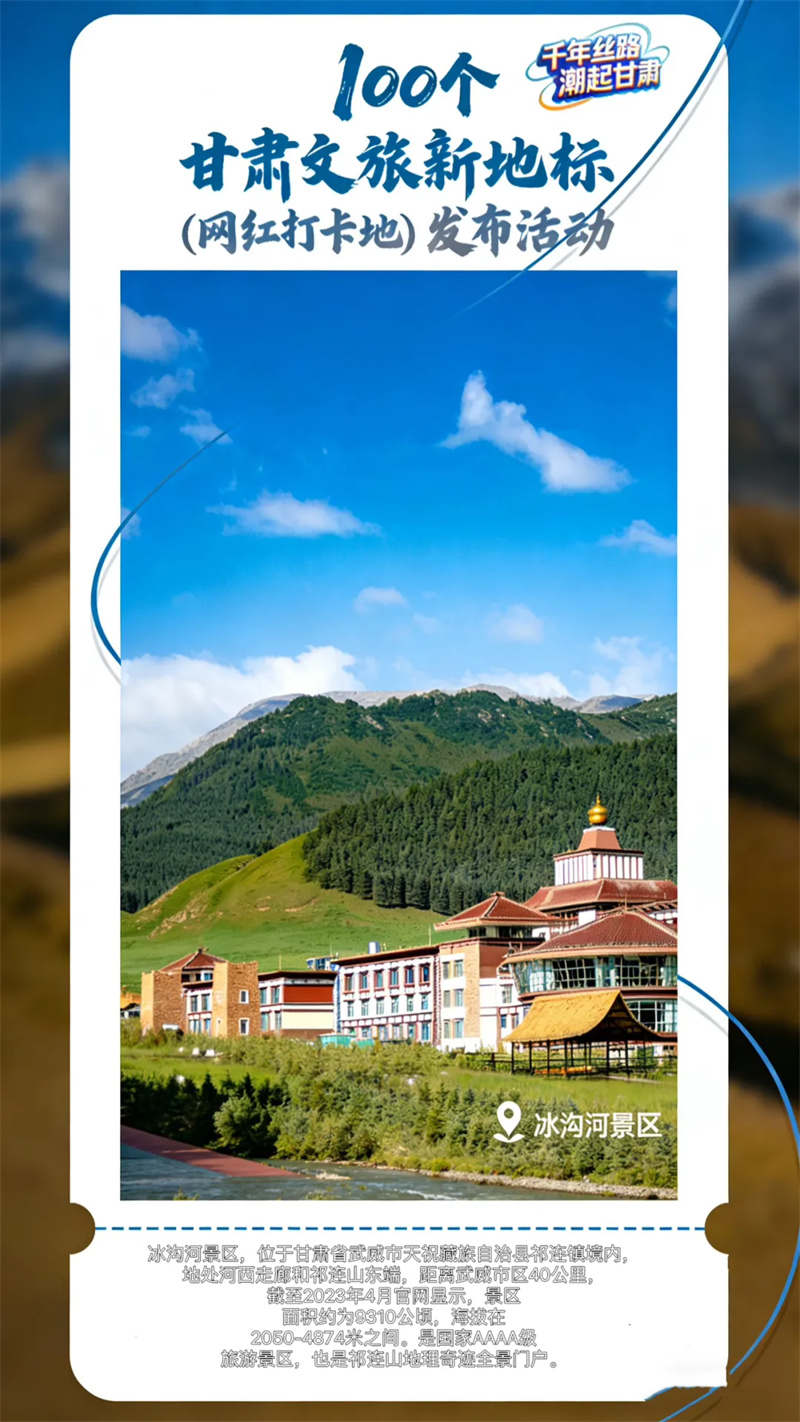 冰沟河景区,位于甘肃省武威市天祝藏族自治县祁连镇境内,地处河西走廊和祁连山东端,距离武威市区40公里,是国家AAAA级旅游景区,也是祁连山地理奇迹全景门户。景区拥有神山、圣湖、冰川、峡谷、牧场、草原和大小10多条河流;有祁连冰川、阿尼岗噶尔雪山、尼美拉大峡谷、柴尔龙海、弘化牧场、马兰花大草原等景观,构成冰沟河景区的川河壮丽与天地大美。景区同时富集历史文化和民俗风情,享有“巍巍祁连、秘境冰沟”之美誉。