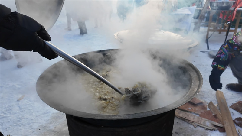 三卡乡工作人员告诉记者,天气是冷,但咱心里热乎!咱这大鹅是自家养的,土豆干是秋天晒的,在这冰天雪地里吃上一锅,那才叫一个香!