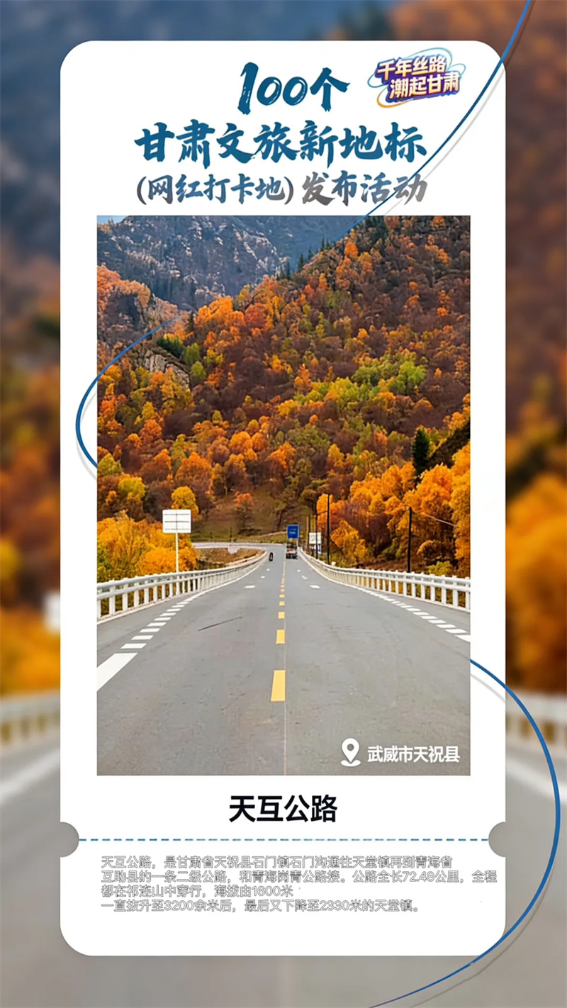 天互公路是甘肃、青海的跨省省际通道,从甘肃天祝通往青海互助,起点位于天祝县石门沟,接G312线,终点位于天堂镇天堂大桥,接青海省岗青公路,线路全长72.48公里。从“天互公路”一路前行,翻越海拔3200多米的五台岭后,一路都是天祝三峡极致的风景,石山、森林、草甸、河流、幽谷、丹霞……一条公路体验天祝万种风情。