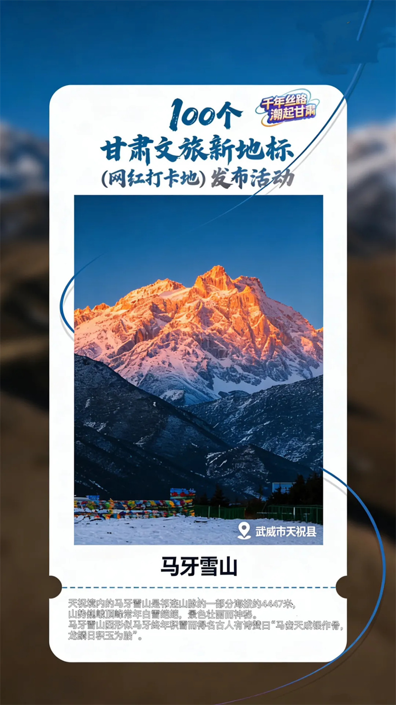 马牙雪山是祁连山脉的一部分,海拔约4447米,山势巍峨,顶峰常年白雪皑皑,景色壮丽而神秘。马牙雪山因形似马牙,终年积雪而得名。古人有诗赞曰:“马齿天成银作骨,龙鳞日积玉为胎”。独特的地理环境,神奇的自然风光,跌宕起伏的山峦,雄伟壮观、气势磅礴,宛如天地间一幅浓墨泼就的山水画卷。